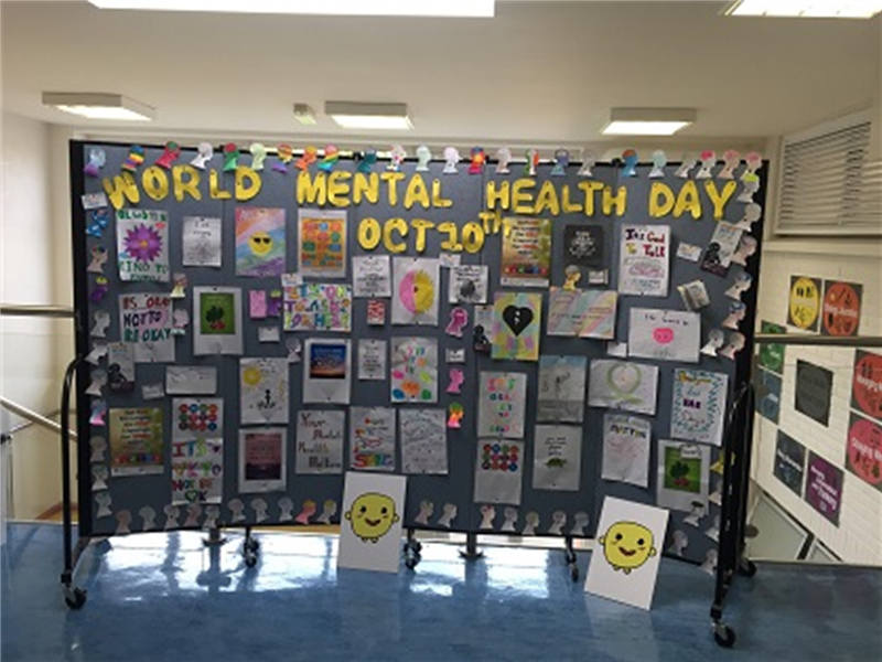 In October 2019 the Wellbeing Team met to organise World Mental Health Day. A display – “It’s ok not to feel ok” was put together where every 1st and 2nd year made positive mental health statements. The Wellbeing Team made announcements to the school about “5 Ways to Wellbeing” and 1st years participated in a Drop in Centre – “Cookie and a chat”.